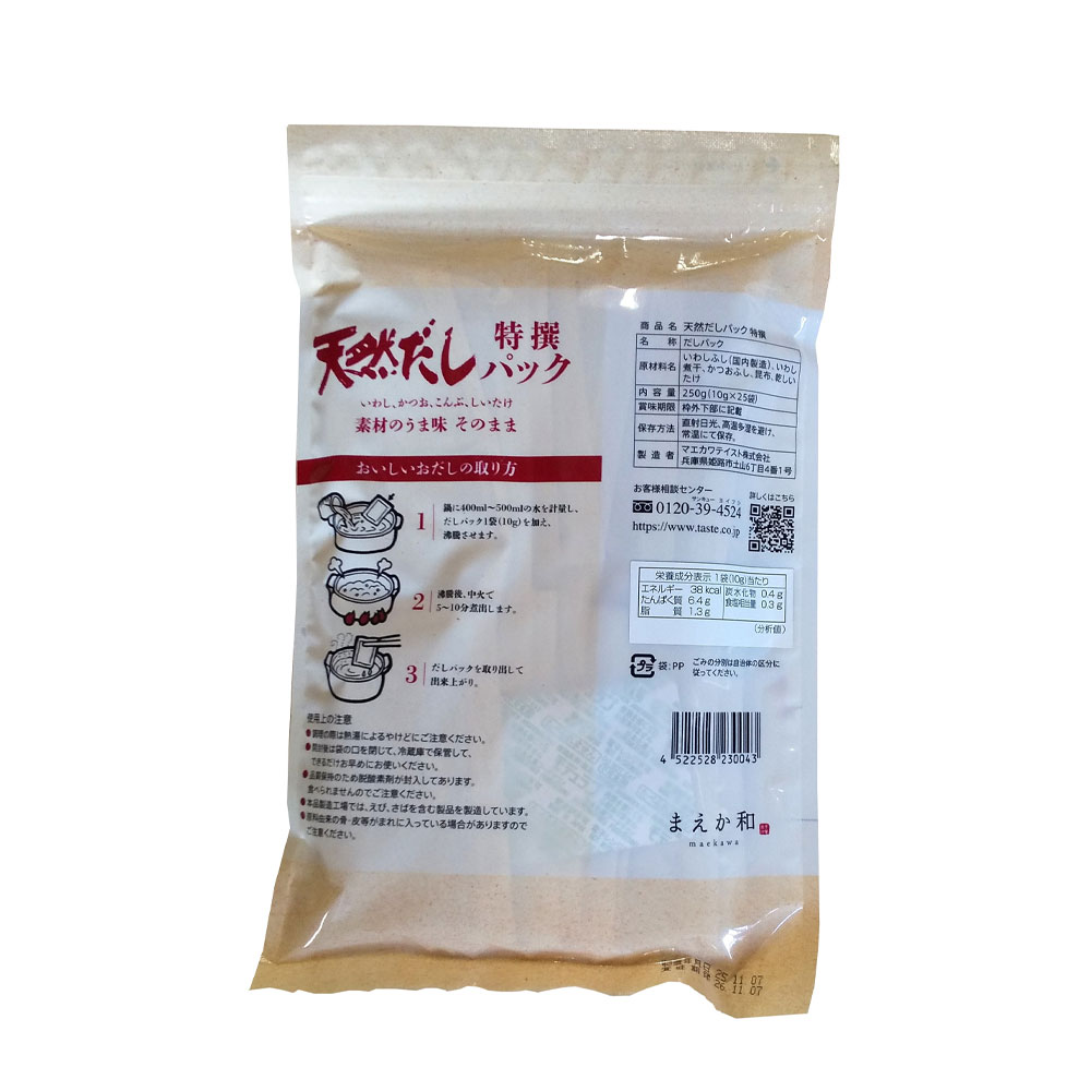 削り節専門店として創業し、削り節を熱水抽出した後に濃縮する独自の「煮釡だし」製法を開発した、だし造り一筋のマエカワテイスト株式会社のだしパックです。