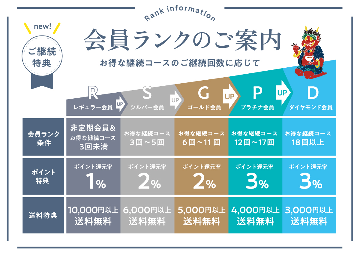 これまで通り、継続コースの継続回数に応じてランクアップでき、ランク特典として通常のお買い物でも送料がお得に。