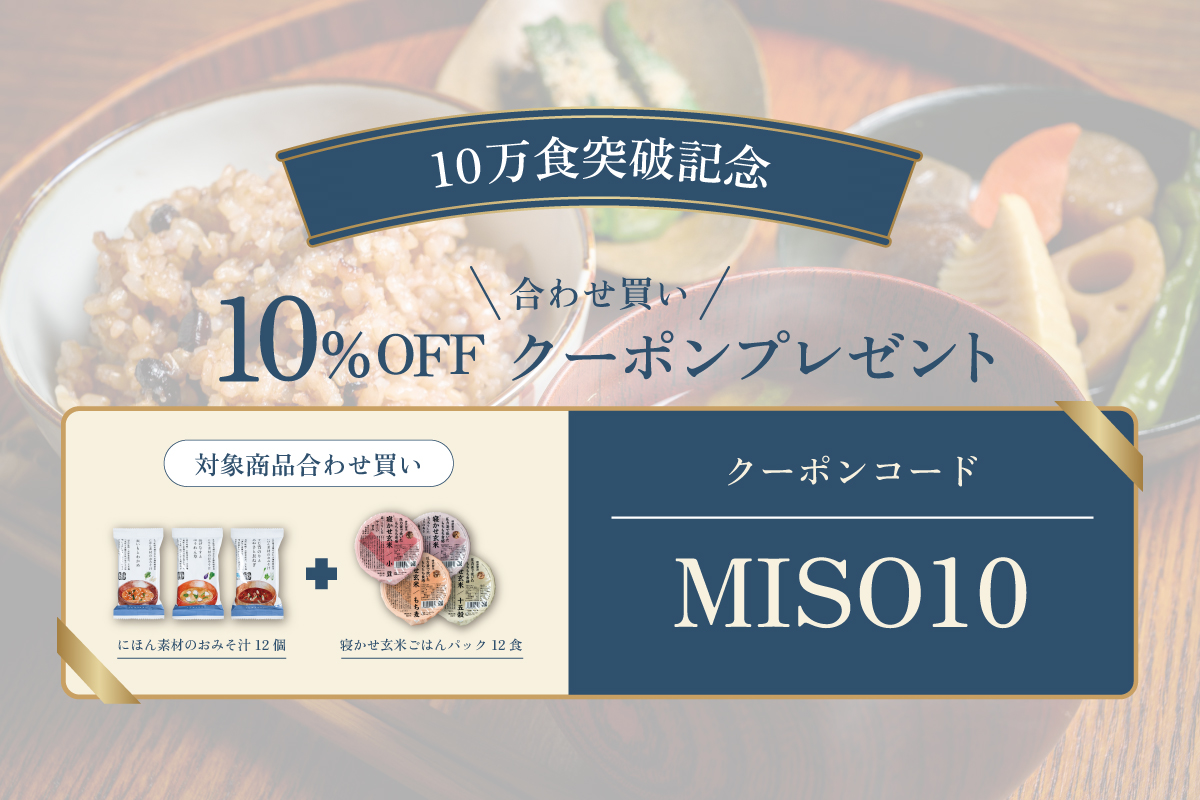 日頃の感謝を込めて、「にほん素材のおみそ汁12食」と「寝かせ玄米ごはんパック4種ミックス12食」の合わせ買いに使える10%OFFクーポンをプレゼント。