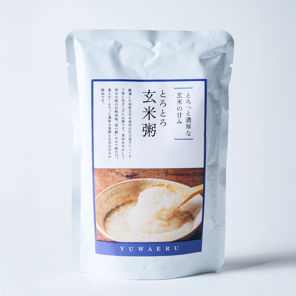 国産玄米をじっくり炊き上げたお粥です。素材を生かして伊豆大島の自然海塩「海の精」のみで味付け。とろっとした食感と玄米の味わい・甘みが特長です。