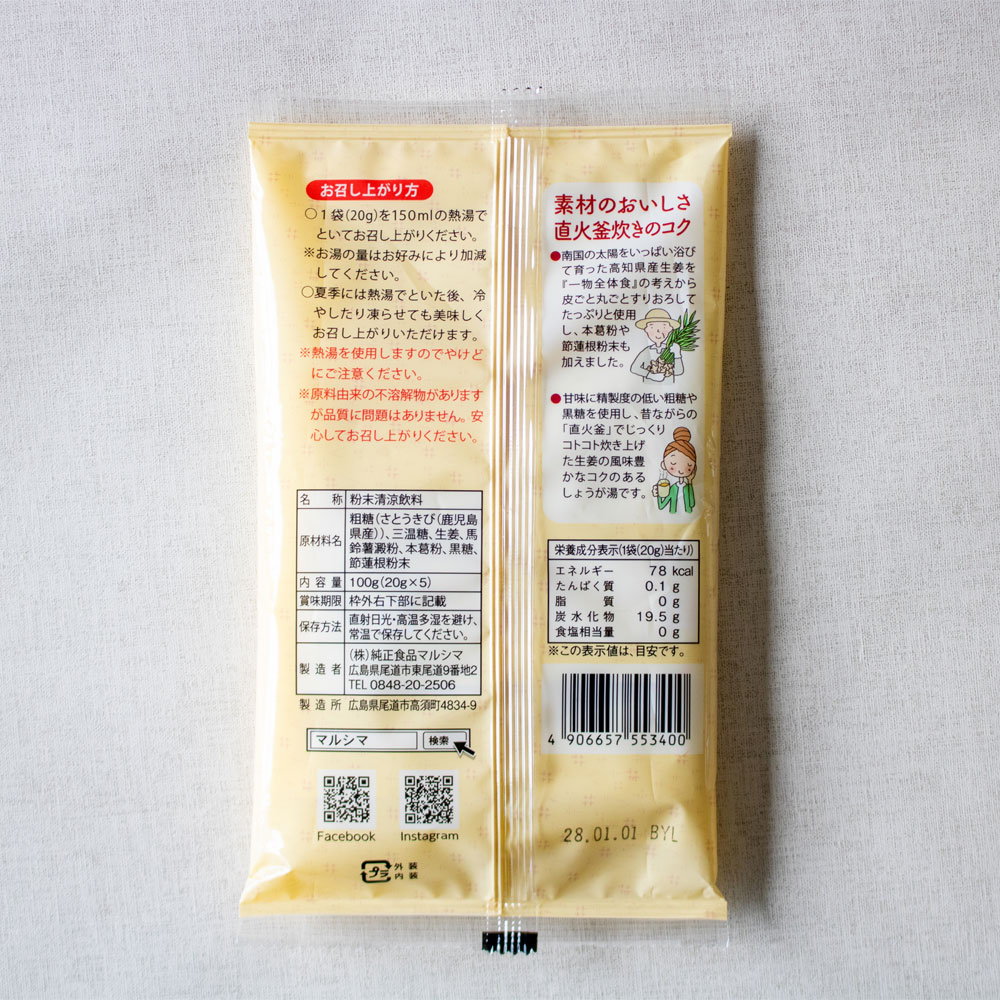 | 原材料 | 粗糖(さとうきび(鹿児島県産))、三温糖、生姜、馬鈴薯澱粉、本葛粉、黒糖、節蓮根粉末 |