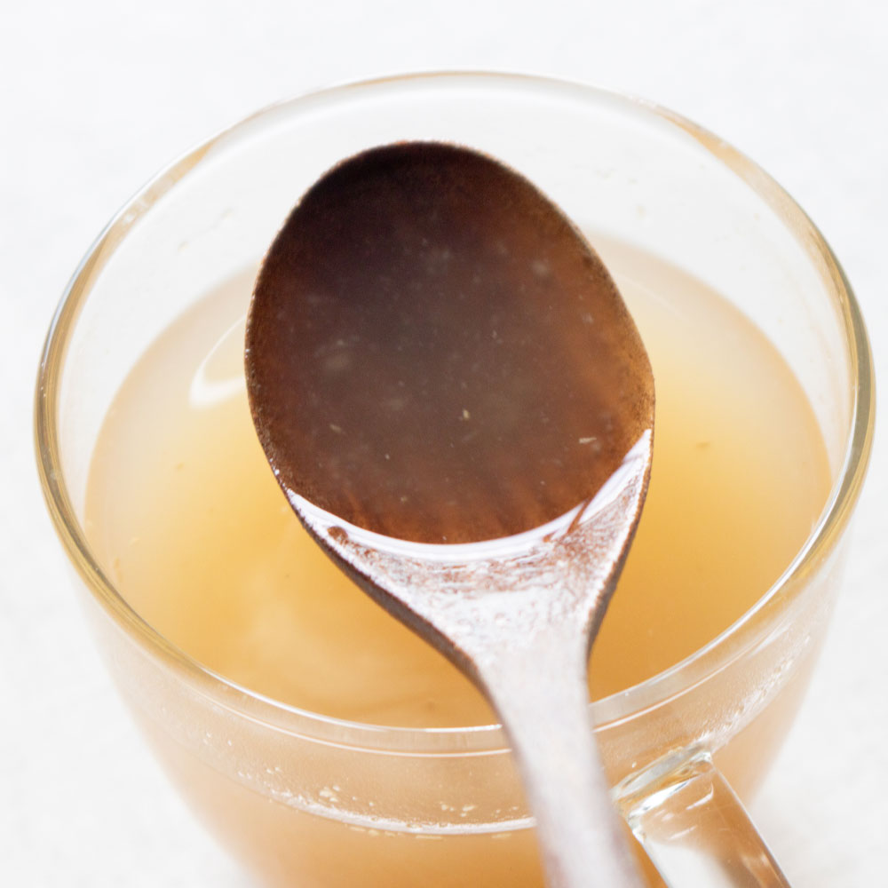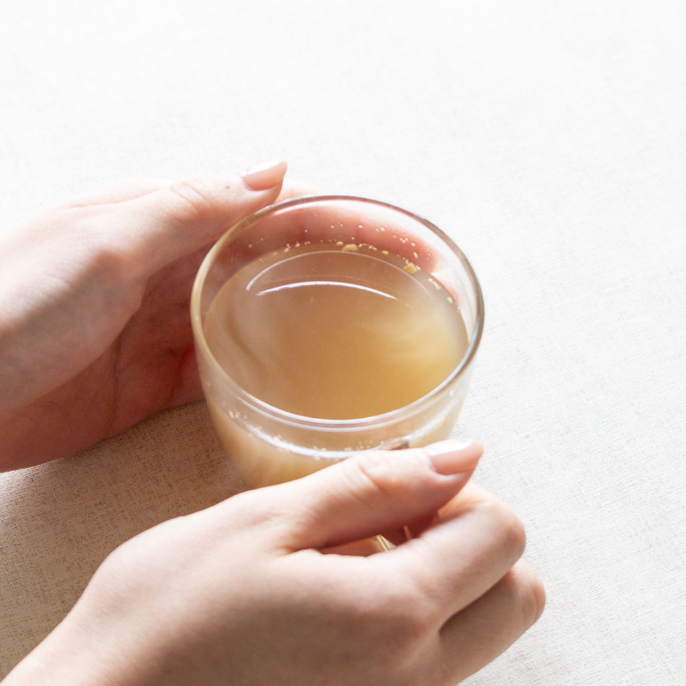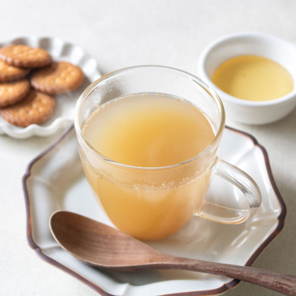 粉末を混ぜ合わせて作る生姜湯に比べ、長時間の炊き込みにより素材全体が混ざり合い、火香(ひが)と呼ばれるコクがうまれます。
