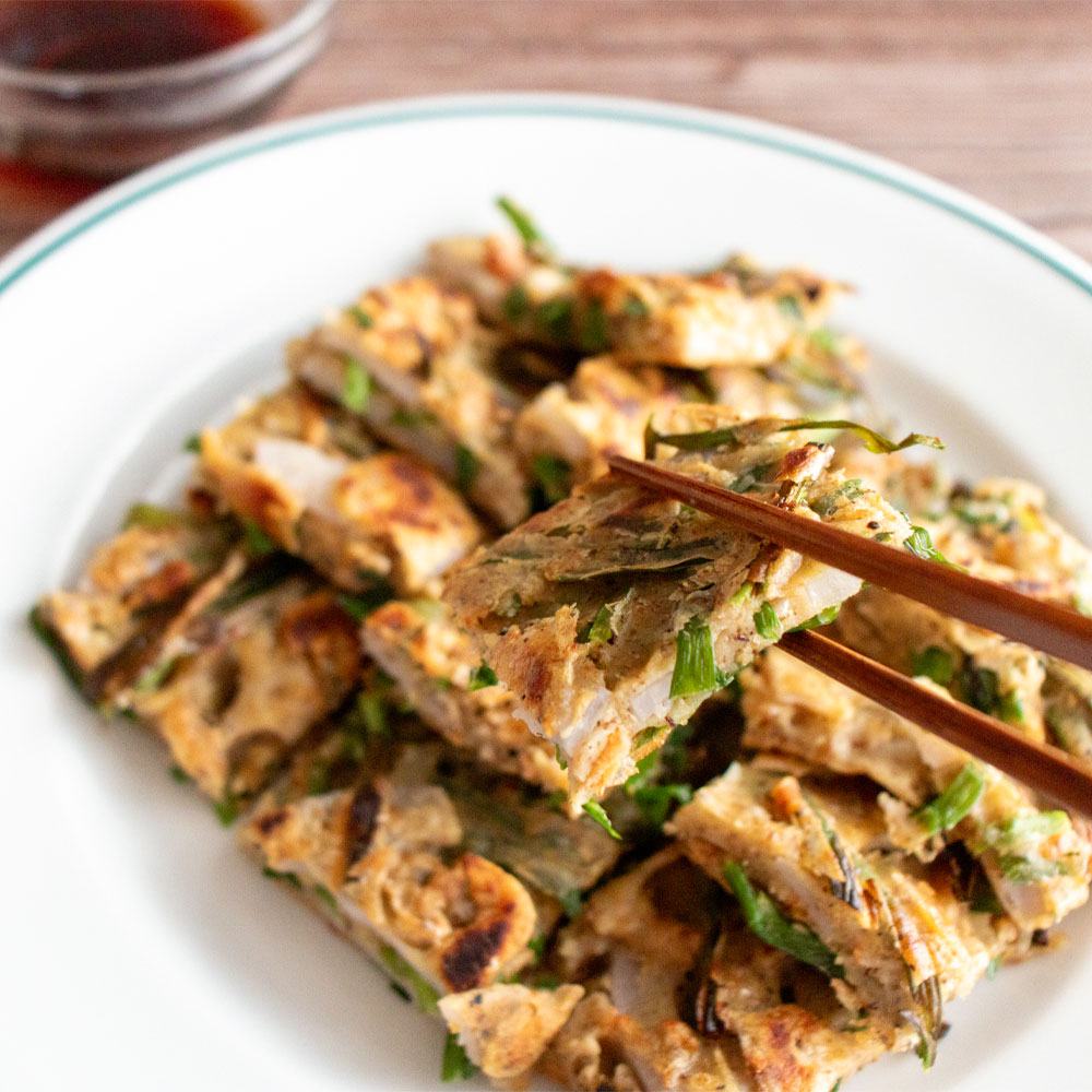 04|焼けたチヂミをカットし、たれを添えて完成。