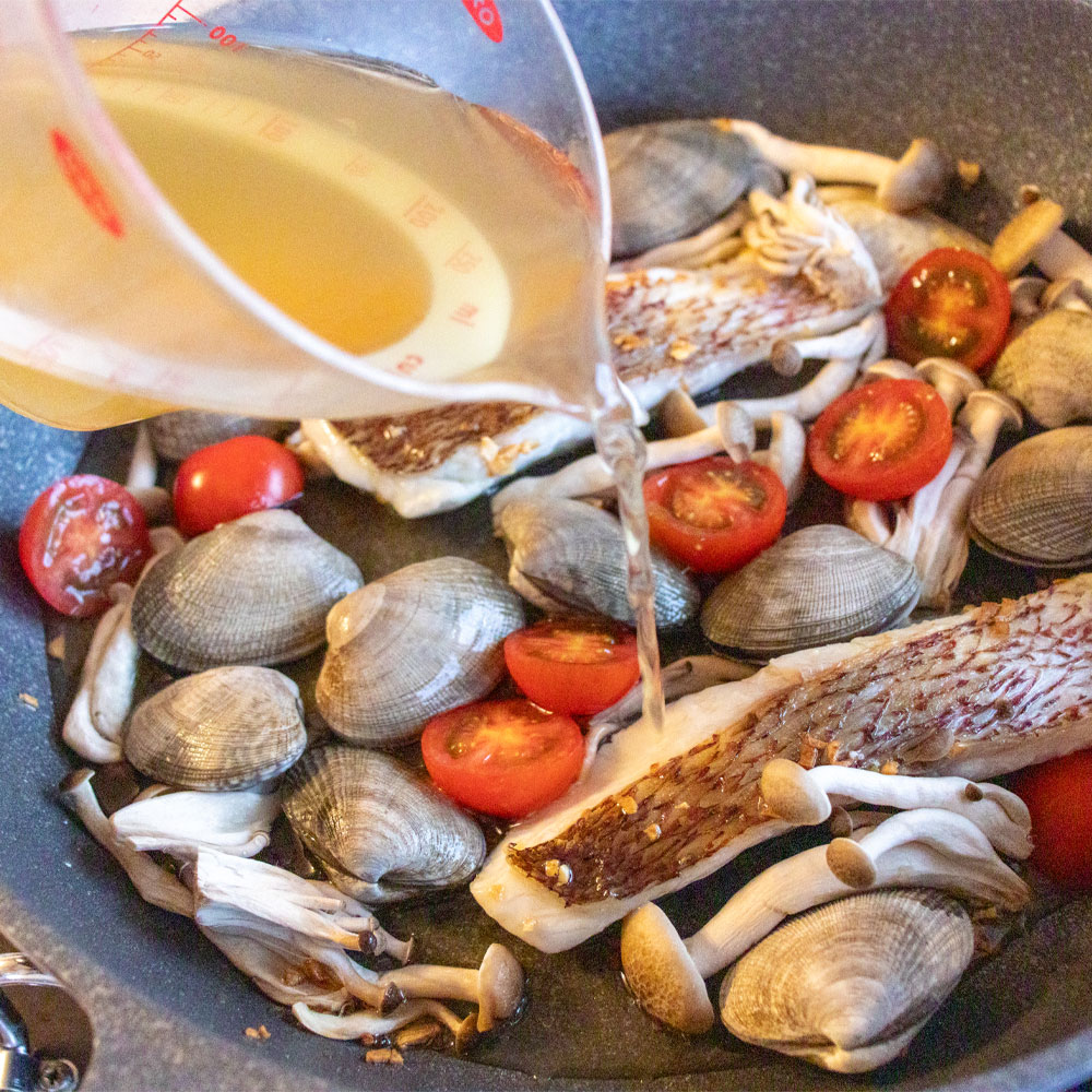 01|あさりは砂抜きしてよく洗って水気をきっておく。鯛は塩少々をふって10分おき、キッチンペーパーで水気をふきとる。しめじは根元を切り小房に分け、ミニトマトは半分に切る。