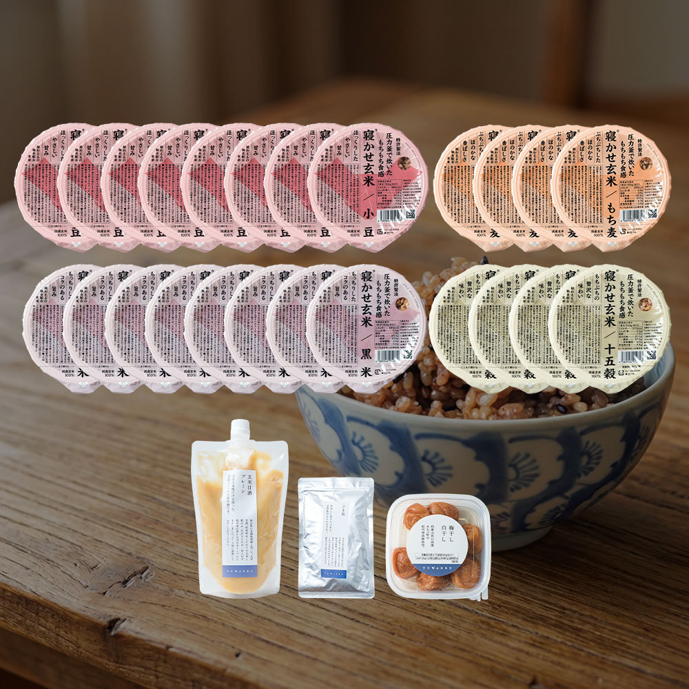 | 原材料 | 寝かせ玄米ごはんパック:【小豆ブレンド】玄米、小豆、食塩 【黒米ブレンド】玄米、黒米、食塩 【十五穀ブレンド】玄米、丸麦、胚芽押麦、もち麦、もち玄米、もち赤米、もち黒米、紫もち麦、はと麦、もち緑米、もちきび、もちあわ、ひえ、たかきび、玄米胚芽、アマランサス、食塩 【もち麦ブレンド】玄米、もち麦、食塩 【ごま塩】いり黒ごま(国内製造)、塩 【梅干(白干し)】梅、漬け原材料(食塩) 【玄米甘酒(プレーン)】玄米(国産)、米糀(国内製造) |