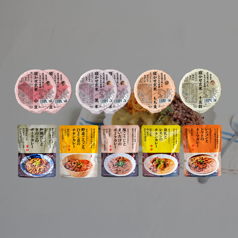 お試しに最適な寝かせ玄米ごはんパック6個と、オリジナルの玄米によく合うカレー5個のセットです。