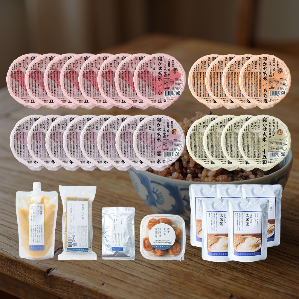 | 原材料 | 寝かせ玄米ごはんパック:【小豆ブレンド】玄米、小豆、食塩 【黒米ブレンド】玄米、黒米、食塩 【十五穀ブレンド】玄米、丸麦、胚芽押麦、もち麦、もち玄米、もち赤米、もち黒米、紫もち麦、はと麦、もち緑米、もちきび、もちあわ、ひえ、たかきび、玄米胚芽、アマランサス、食塩 【もち麦ブレンド】玄米、もち麦、食塩 【ごま塩】いり黒ごま(国内製造)、塩 【梅干(白干し)】梅、漬け原材料(食塩) 【有機玄米もち】有機水稲もち玄米(国産) 【玄米粥】玄米(茨城県産)、食塩 【玄米甘酒(プレーン)】玄米(国産)、米糀(国内製造) |