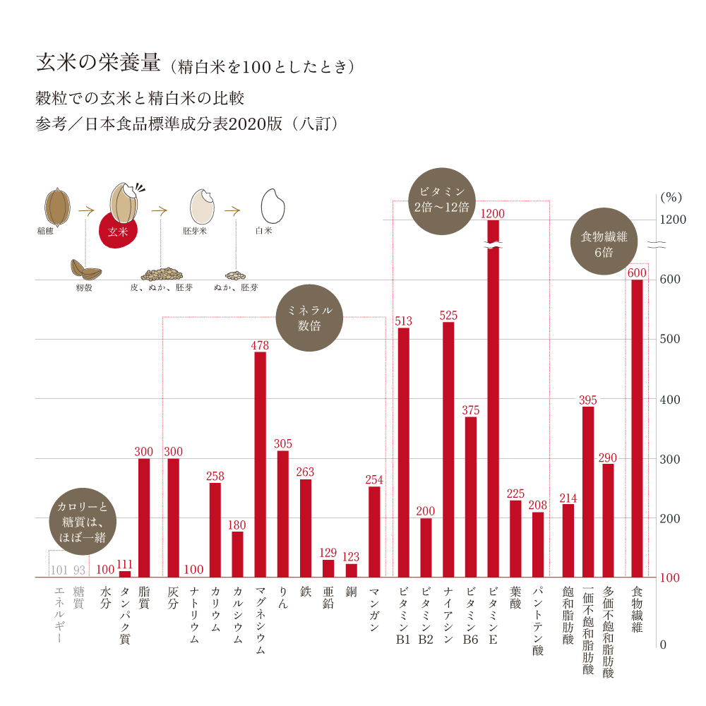玄米の胚芽・米ぬかには、食べたものを消化し、きれいに代謝してくれる副栄養素(ビタミン・ミネラル・食物繊維)がたっぷり含まれています。白米と比較すると、その栄養量は数倍から12倍。副栄養素をたっぷり摂取できる玄米を食べることで、一緒に食べるおかずはもちろん、体に蓄積した余分なものさえも一緒に代謝・排泄してくれます。