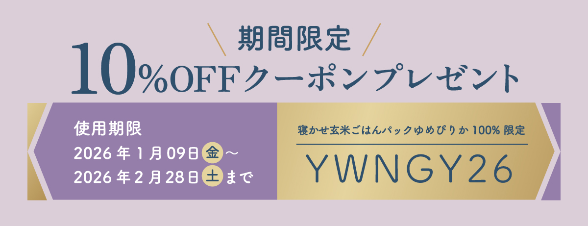 ※本クーポンコードは、「寝かせ玄米ごはんパック ゆめぴりか100%」のみ対象です。