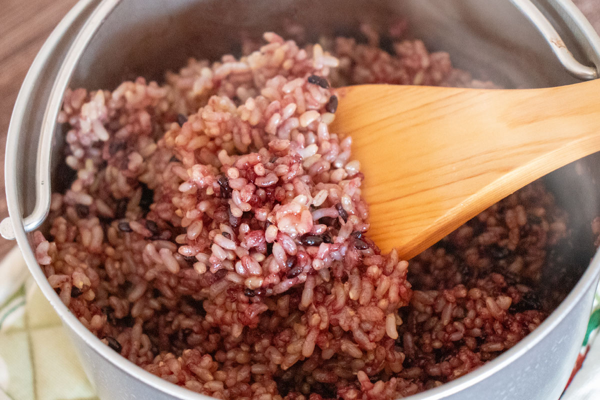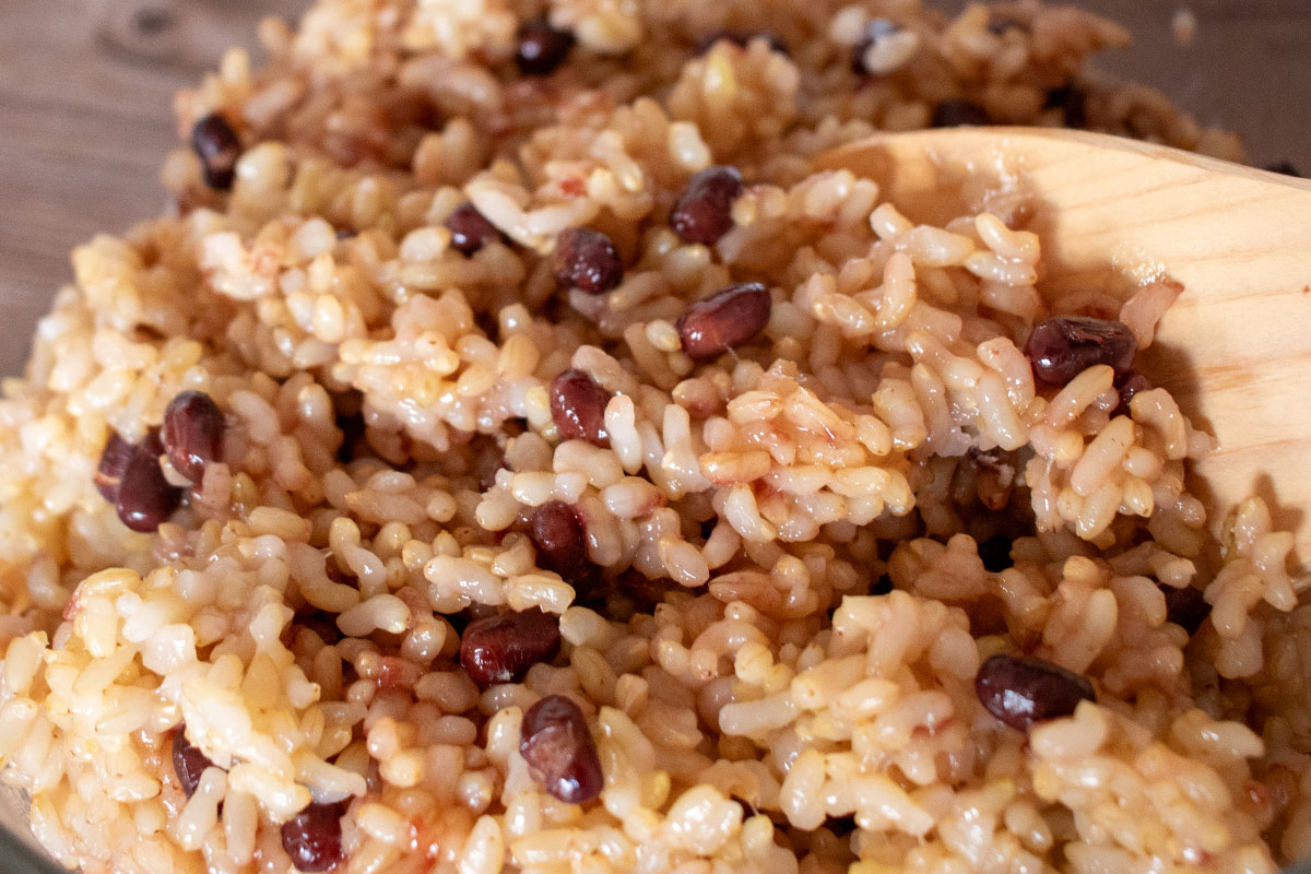 ふっくらとやさしい甘みのある小豆は、寝かせ玄米との相性も抜群。