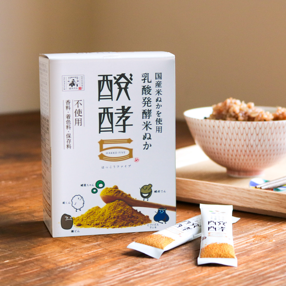 「発酵5」は、玄米の胚芽・米ぬかに含まれる栄養素(ビタミン・ミネラル・食物繊維)に、生きた菌(乳酸菌、ビフィズス菌、糀菌、酵母)をプラスして独自製法で顆粒状にした乳酸発酵米ぬかサプリです。
